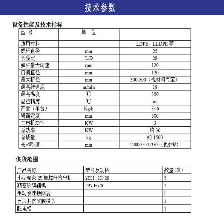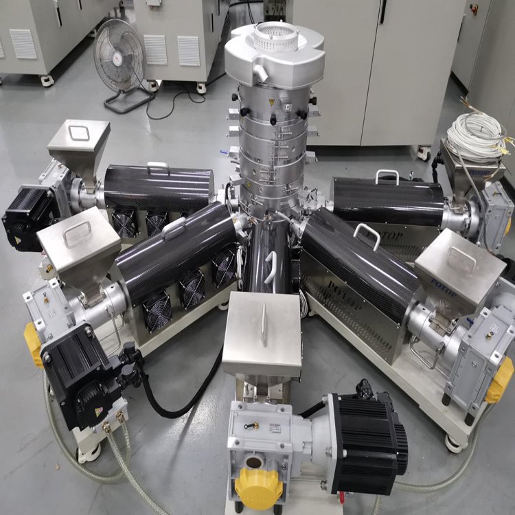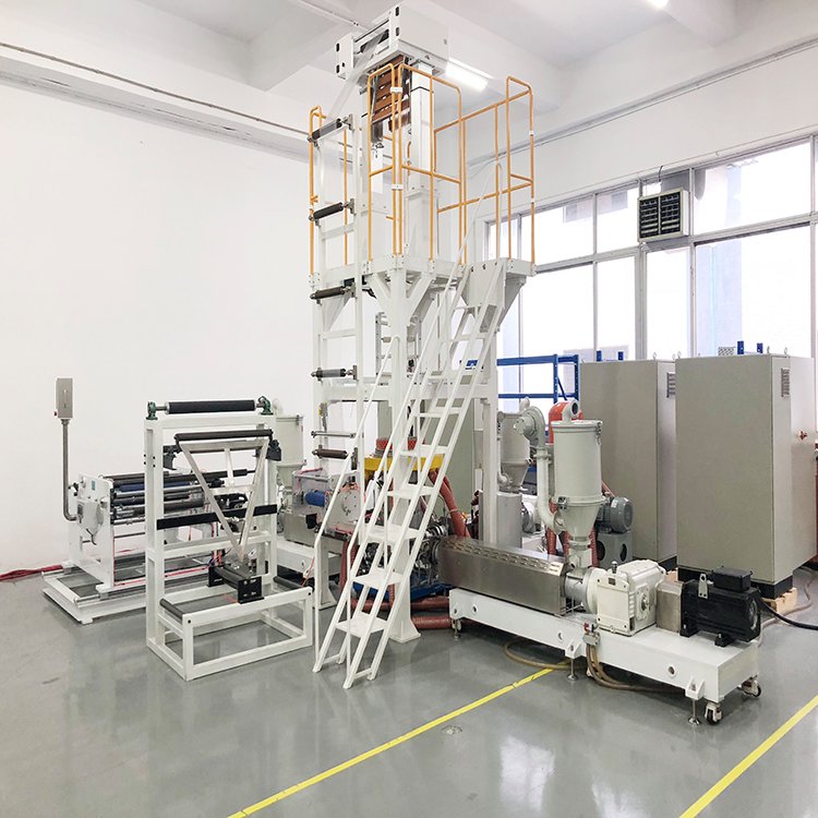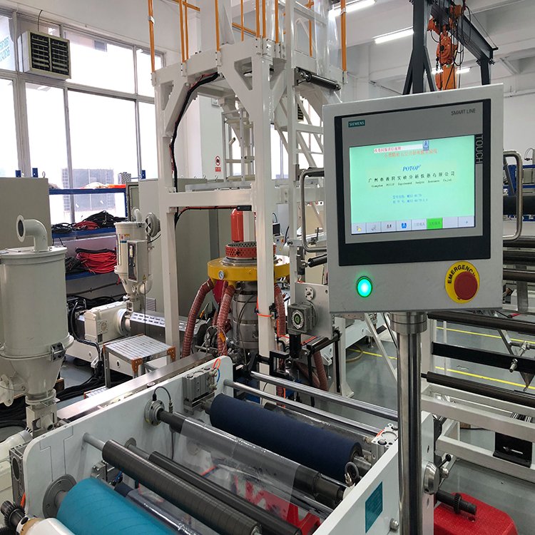 五层多层共挤吹膜实验线可用于测试和加工多种材料,并自动精确地完成挤出过程中的熔体压力、温度等重要信号的测量。该吹膜机主要应用于新材料配方研发,材料吹膜性能测试、色母料分散性能测试、吹膜机生产工艺参数优化、颜料分散性能测试等范围。