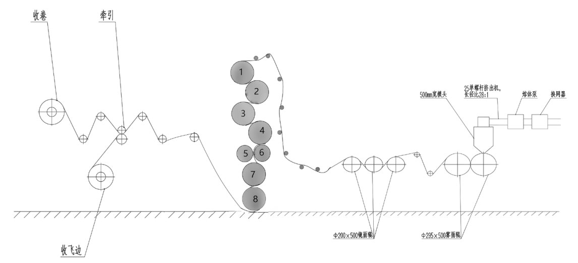 PVDF挤出流延纵向拉伸试验机主要由1台小型精密单螺杆挤出机、1套换网器、1套熔体泵、1套流延模头、1套小型精密流延单元、1台单点纵向拉伸单元、1台牵引收卷单元组成。可在线完成塑化挤出、流延、拉伸、切边、收卷等功能。