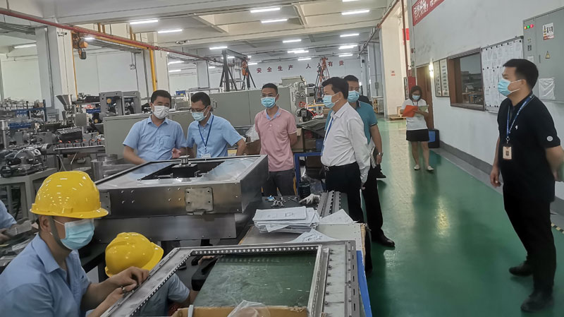 在我们薄膜双向拉伸仪的组装工作区域,观看了烘箱部分的组装工作。王晓生书记对我司的工作予以了肯定和赞赏。对我司干净、宽敞、整洁的车间予以高度评价。