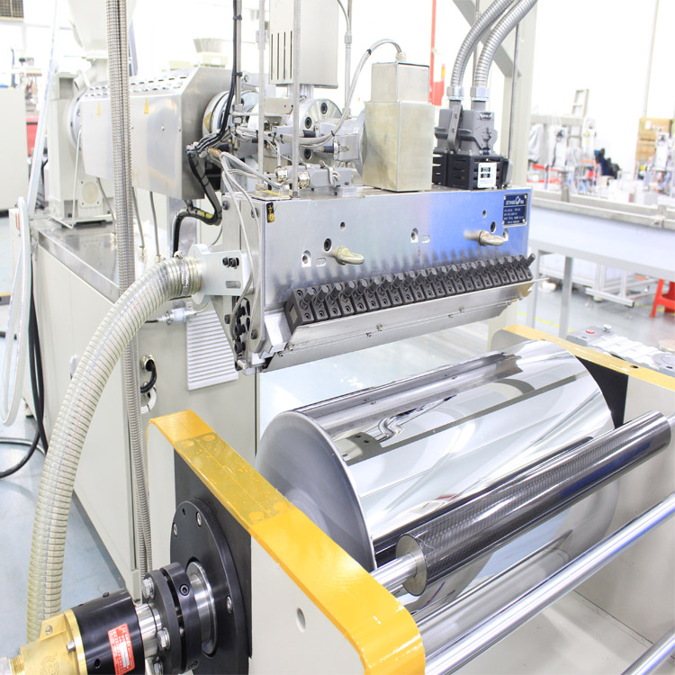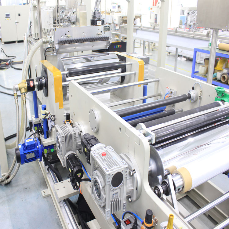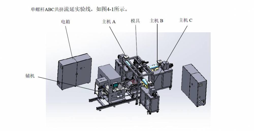 PLA聚乳酸薄膜挤出流延实验机,主机主要由机架、主电机、联轴器、传动箱、烘干喂料机、挤出组件、冷却系统、熔体泵组件、模具以及电气控制系统等组成,辅机由流延、牵引收卷机系统组成。
