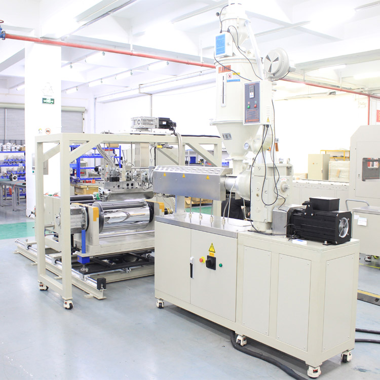 2023.10PLA聚乳酸薄膜挤出流延实验机,主机主要由机架、主电机、联轴器、传动箱、烘干喂料机、挤出组件、冷却系统、熔体泵组件、模具以及电气控制系统等组成,辅机由流延、牵引收卷机系统组成。