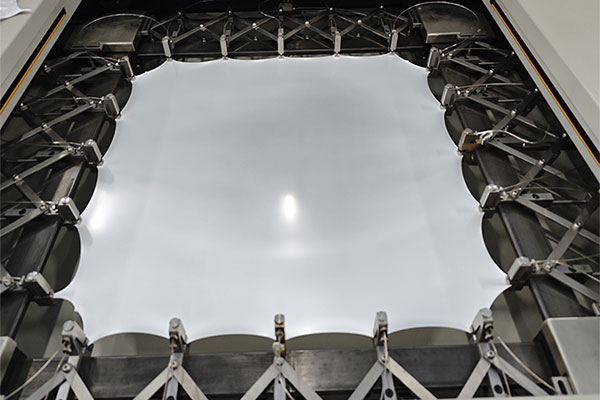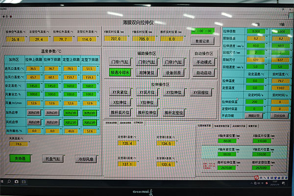薄膜原点双轴双向拉伸仪由装夹组件、拉伸组件、拉伸机构移动组件、热烘箱组件、气动风帘组件及电气控制系统等组成,能将一定尺寸的膜样片按所需拉伸比,在适合温度及时间内进行拉伸试验。